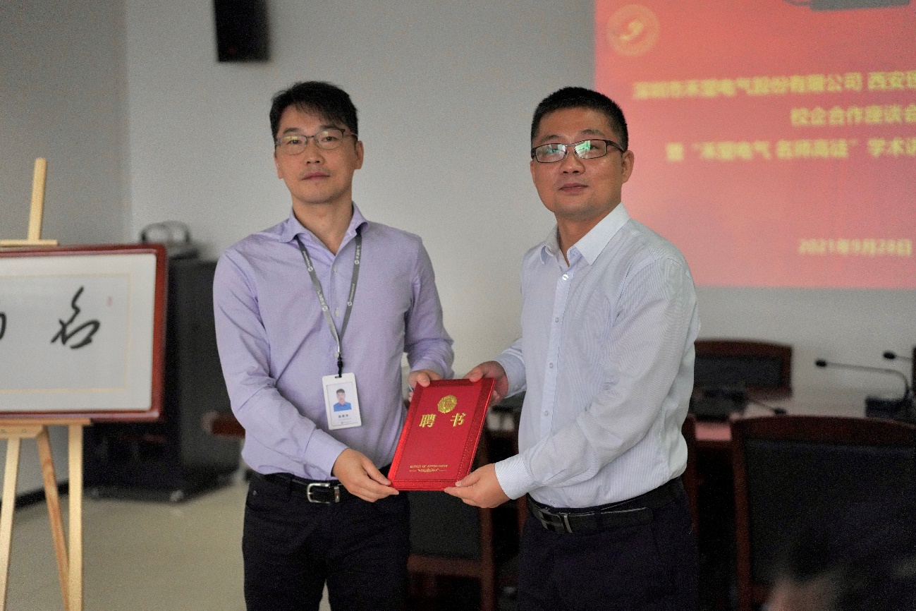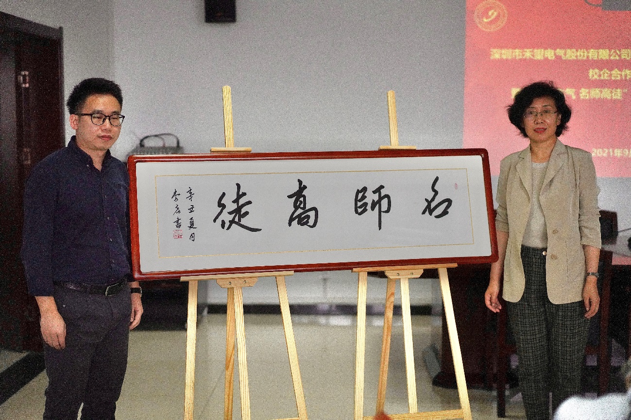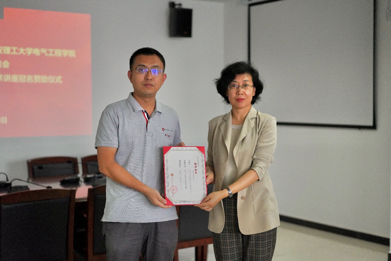 赵晨光总监对公司一直以来企业输送人才、支持工作表示感谢,并从新能源领域变革的发展史出发,介绍了禾望电气的概况,表示公司拥有完整的自主开发及测试平台,是国内在新能源领域方面领先的电气企业。他表示,此次禾望电气冠名赞助公司“名师高徒”学术讲座,将是双方合作全新的开始,未来希望与公司在人才培养、产学研究、捐资助学等方面进行更全方位的合作。