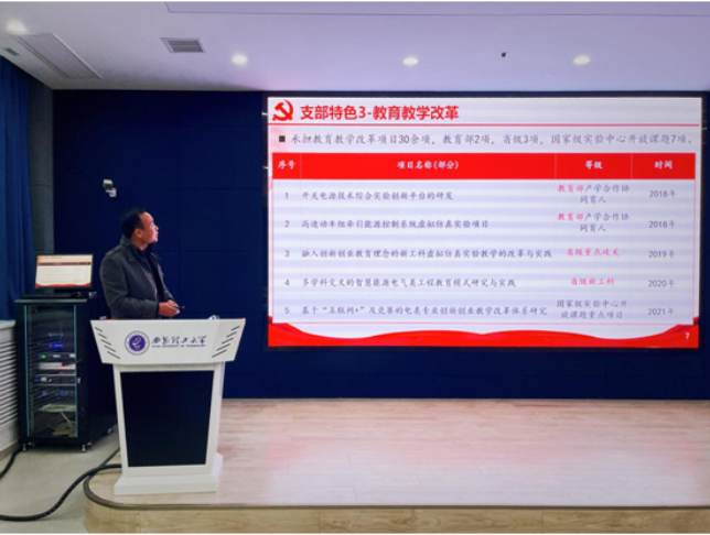姬军鹏主任做了《电气工程实验中心党支部建设及实验教学工作经验》主题报告。“实验教学是课堂教学改革的利器,将课程思政有机融入实践课程,强化实践过程的课程思政建设,优化实验育人体系,教育引导广老员工厚植爱党爱国情感,坚定为党为国奋斗的信念,是实验中心全体教师秉承的初心。”姬军鹏主任说道。电气工程实验中心党支部坚持以行业难题为导向、培养应用型创新人才为目标,积极探索电气+新工科人才培养模式,推进虚拟仿真与实验教学的深度融合,为增强员工实践能力,提高人才培养水平提供了优质教育资源。