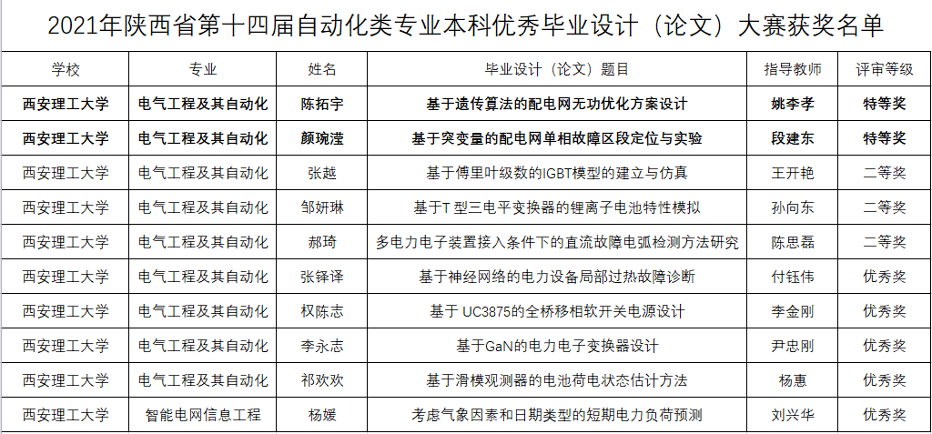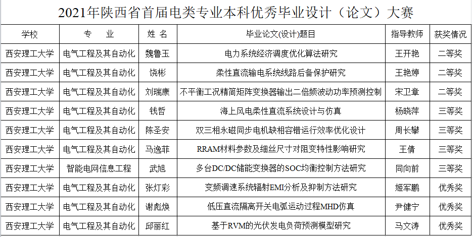 为进一步提高本科毕业设计(论文)质量,培养创新型人才,促进公司本科生专业教育的发展,公司高度重视毕业设计质量的不断提升,积极参加各类优秀毕业设计评选,并屡获佳绩。公司2021届毕业设计分别在陕西省自动化学会、陕西省电源学会及公司组织的优秀毕业设计评选比赛中获得优异成绩。