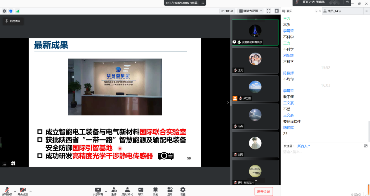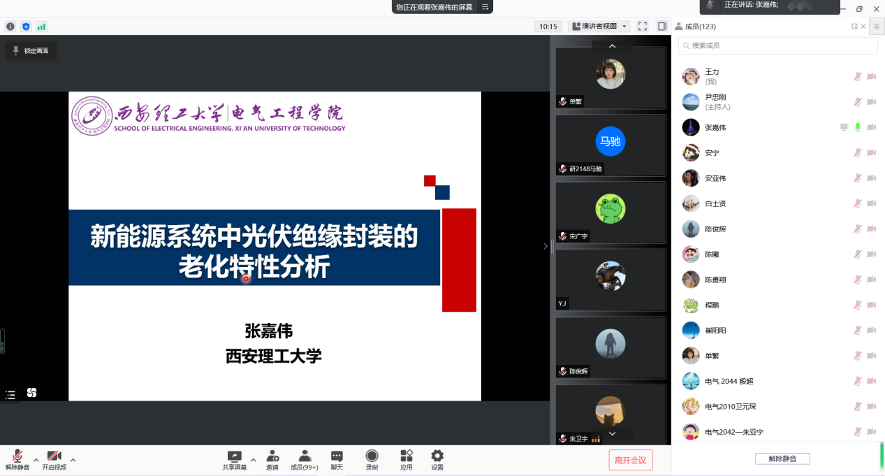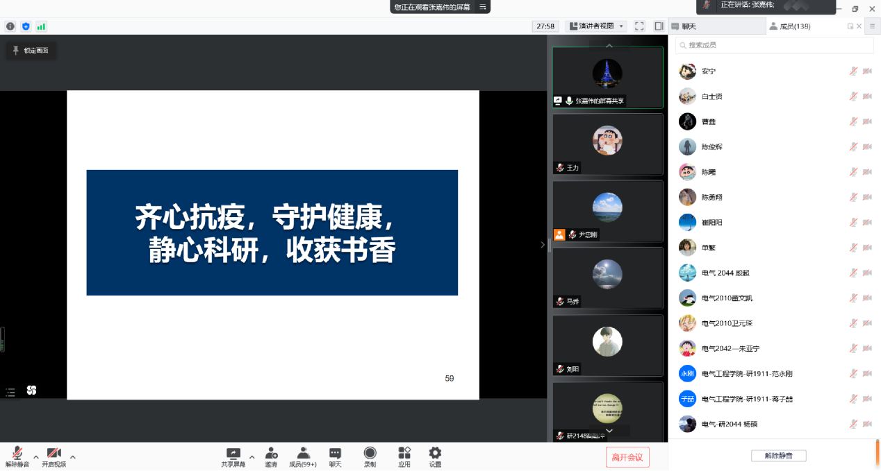 最后,讲座在热烈的“云掌声”和员工的感谢中圆满结束!本次讲座在让同学们了解新型电力系统下新能源绝缘特性的同时,拓宽了研究思路,开拓了国际视野,紧跟时代的步伐,让同学们的所知、所识站在技术的前沿。最后,张嘉伟老师倡导同学们展现新时代研究生积极向上的精神风貌,齐心抗疫,守护健康,静心科研,收获书香。