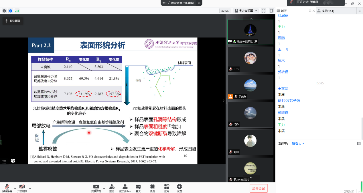 接下来,张嘉伟老师分别对不同结构的绝缘背板盐雾老化特性和放电图谱进行了介绍。张老师从研究方法和科学思维训练两个不同的角度切入,让同学们在了解光伏绝缘系统的同时也学习到了独特的科研学习方法,比如在研究工程问题时,要把宏观-微观相结合以及用交叉学科思维来剖析科学问题来制定合理的研究路线。同时,研究过程中要注重对外交流,在国内外学术合作中努力实现科技创新互利共赢。期间张老师与同学们一起交流互动,同学们踊跃发言。
