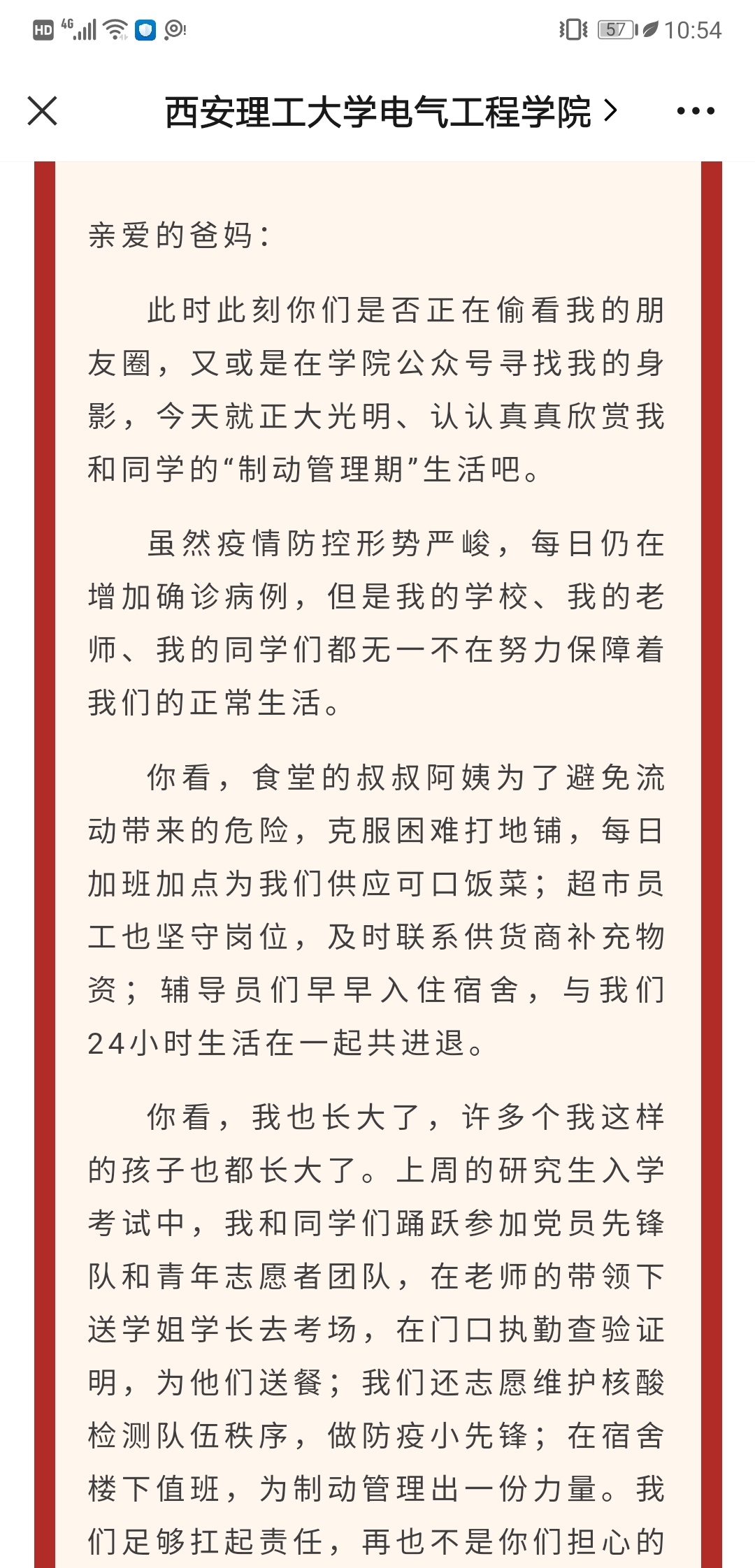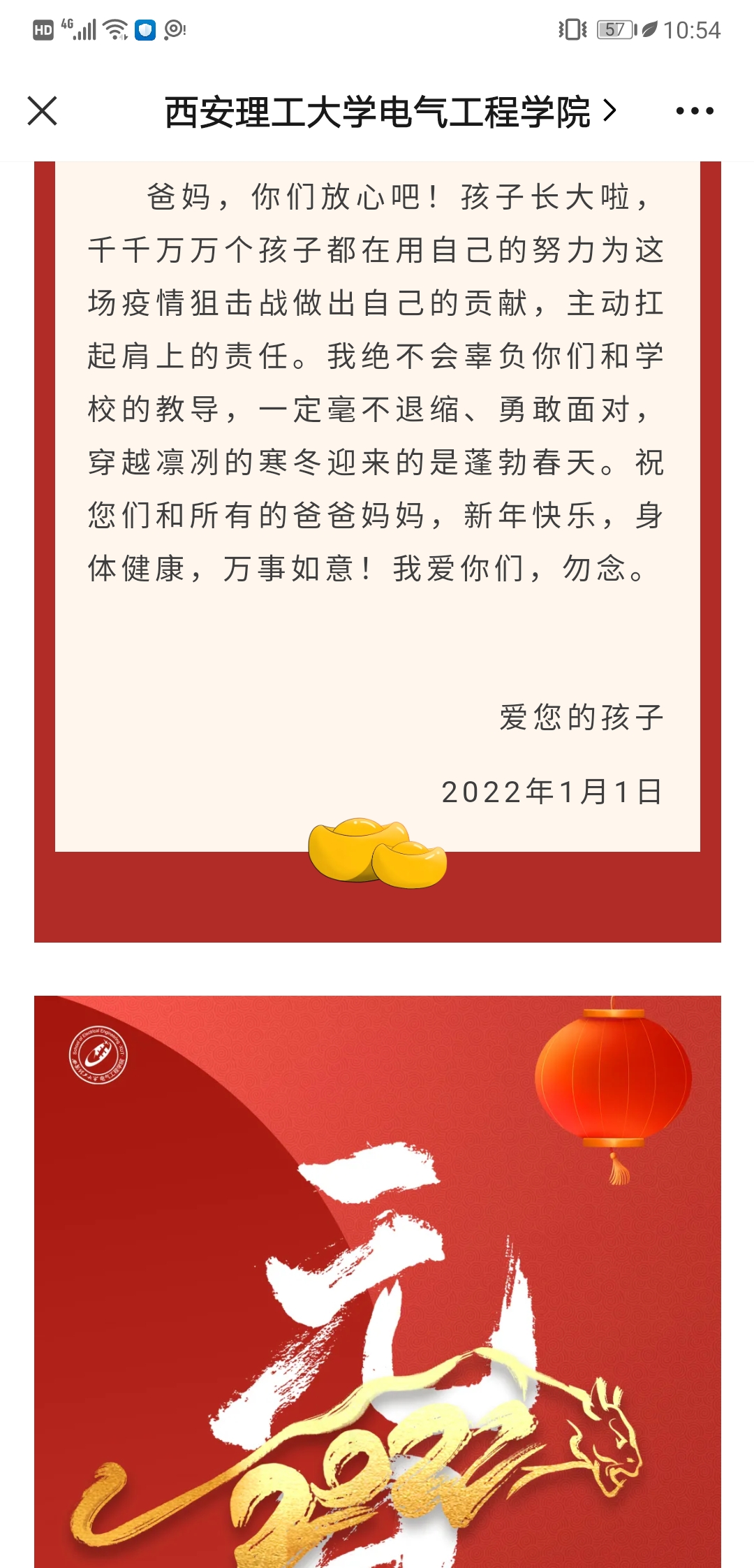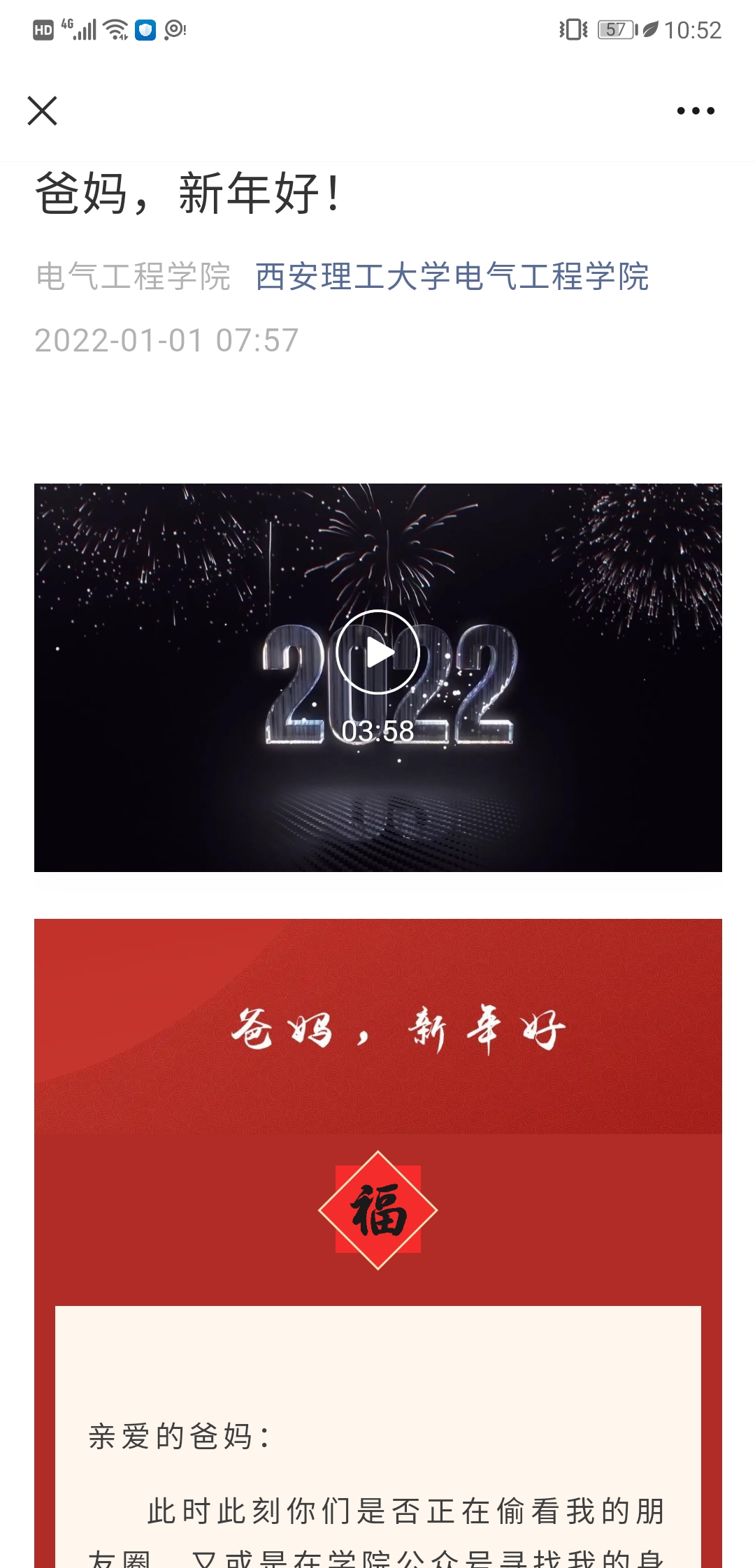 在严峻的疫情防控形势下,研究生的心里疏导至关重要。2022年的第一天,因疫情的“封锁”,万千西安学子只能“制动”在宿舍,最关心、牵挂、思念他们的无不外乎是他们自己的父母。为此,公司在新年第一天,特别发起了专题活动“爸妈,新年好”,制作了推文并录制了视频,向无法在这个新年陪伴他们的父母展现在校健康、稳定的生活,也传达学子们对父母、家人的祝福。