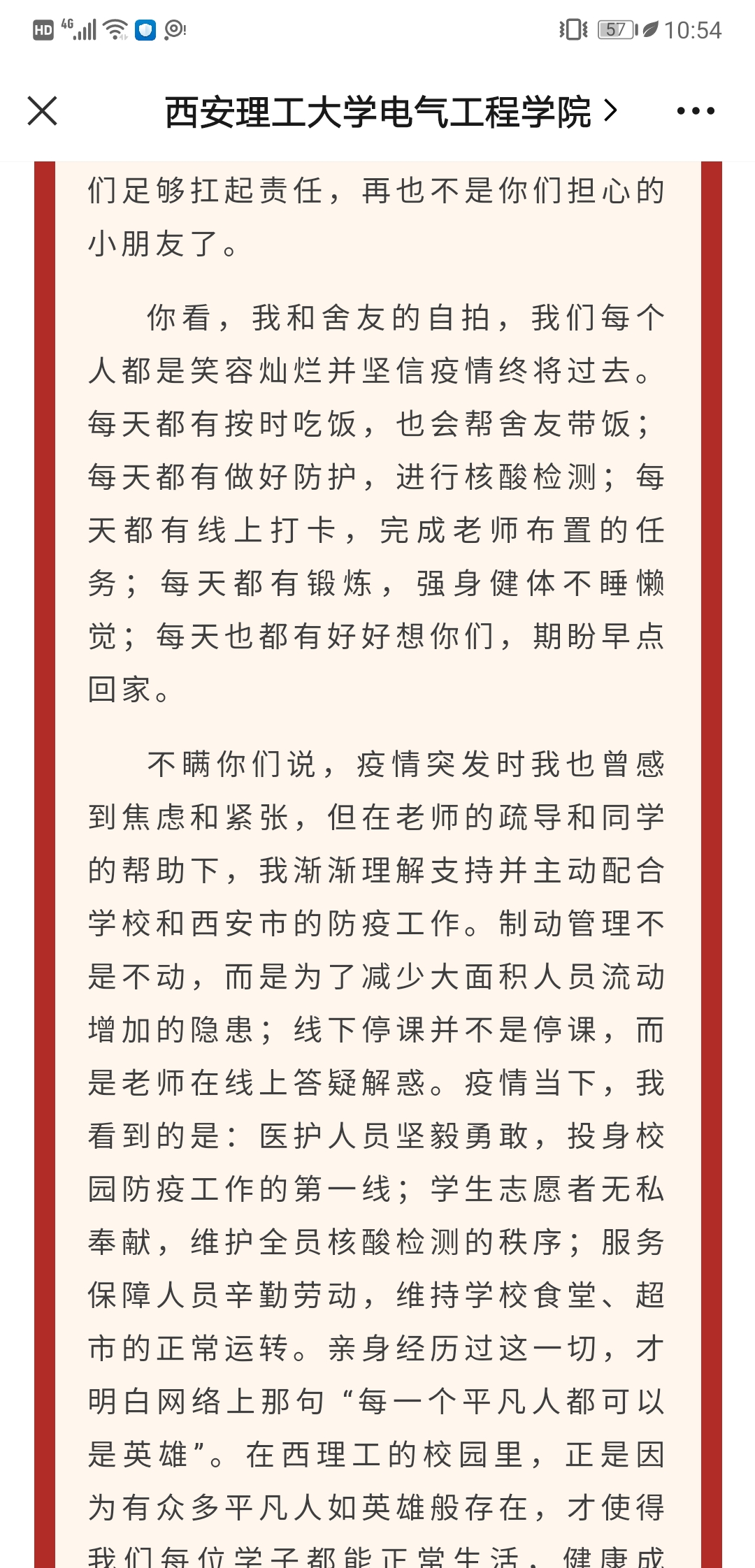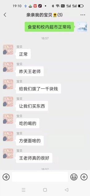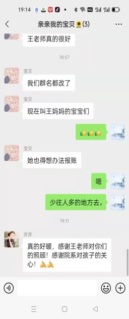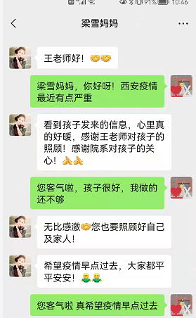 封城当天晚上,王倩老师与指导研究生的家长逐一联系,请家长们放心,员工家长看到老师发的消息后,感觉非常暖心,表示我们“家校联动”,疫情更能尽快解除。