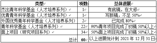 通过系所科研主任上报、科研秘书与经理“纵横”摸排,通过各种方式问询了每一位教师后,确定了公司拟申报2022年国家自然科学基金的负责人、项目类型、初步题目、进展情况等。83位专任教师中有56位拟申报,占67.5%,外加兼职教师、即将入职博士一共拟申报60项基金项目。这些拟申报的项目中,类别、项数、进展统计如下。