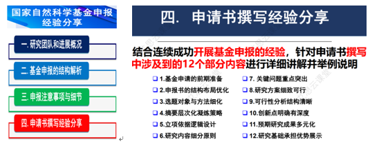(2)12月22日晚上,要求所有老师参听了1小时的直播《国家自然科学基金申报经验分享》,23日下午分享了该直播的PPT,对申报书中撰写过程中涉及到的12个部分内容进行详细讲解与举例说明,进行了一轮实打实的集中培训。