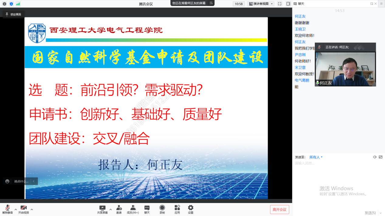何正友教授结合自己个人及团队申请基金历程,通过视频主要分析了两部分内容即基金的申请及团队建设。首先,他指出“有充分准备”、“有强烈意愿”,辅导才能发挥作用。一定要重视基金的申请,认真思考基金的研究方向与研究目标,要有抛开一切其他事务杂务的科研精神,才能撰写好一份优秀的基金申请。同时,基金的选题应做到鼓励探索、突出原创;聚焦前沿、独辟蹊径;需求牵引、突破瓶颈;共性导向、交叉融通。然后,他以自己和团队多本申请书为实例,鼓励结合国家经济建设和社会发展的重大需求进行选题,鼓励申请人提出的具有创新学术思想和特色的项目申请,一定要注意项目的基础性和创新性,要注重凝练关键问题。其中,青年基金应从科学价值、创新型、社会影响、可行性/申请人的创新潜力等方面判断和评价。基金选题的重中之重是创新,创新来源可以是:(1)工作中积累;(2)工程实际中发现;(3)文献调研中产生。他强调一定要深入调研,做到有数据支撑,有案例支撑,有切身感受,切忌假、大、空。