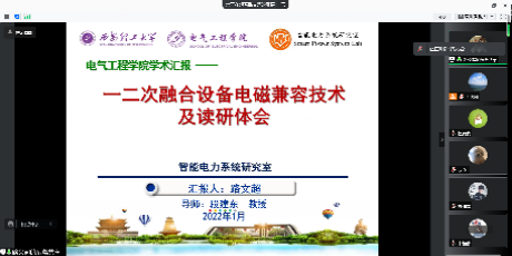 第一位分享者是路文超同学,汇报的主题是“一二次融合设备电磁兼容技术及读研体会”。电网暂态过程屡屡导致新型电力设备受到电磁干扰,路文超同学综合考虑一二次融合设备在遭受暂态辐射磁场干扰时的受扰情况,建立一二次融合配电开关电磁暂态模型,根据辐射磁场干扰特点提出三种防护优化方法。对比显示所提方法均可不同程度削弱暂态辐射磁场对二次回路的干扰情况。同时,路文超同学为在线同学分享了自己的读研体会。