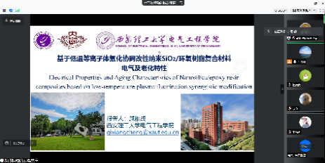 第三位分享者是戚相成同学,汇报的主题是“基于低温等离子体氟化协同改性纳米SiO2/环氧树脂复合材料电气及老化特性”。戚相成同学采用偶联剂协同等离子体氟化处理纳米SiO2,并制备不同填充比例的SiO2/环氧树脂复合材料,对复合材料进行紫外老化。研究表明,纳米SiO2的添加可有效屏蔽紫外线,提高抗老化性能。