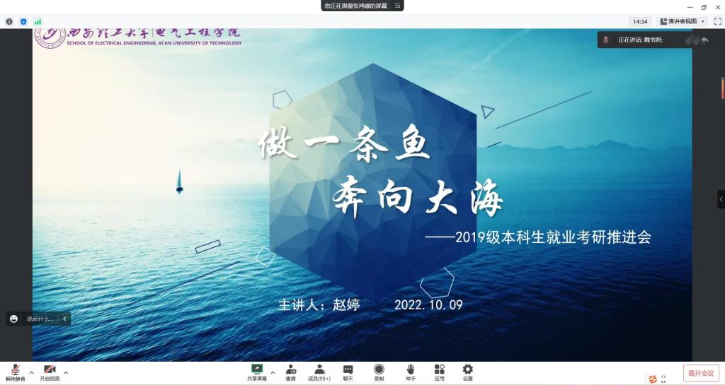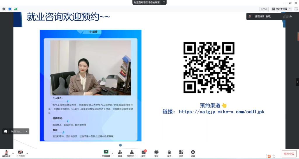会上,魏书妍首先强调了近期工作,提醒同学们要严格遵守疫情防控相关要求,鼓励大家在大学最后一年认真思考未来选择,明确目标并付诸努力。随后,赵婷结合前期“一对一就业意向摸排”情况,有针对性地介绍了目前的就业形势,提醒同学们合理规划复习时间,调整状态面对考研。接着,赵婷分析了公司近几年的就业情况,分享了现阶段企业招聘需求,鼓励同学们解放思想、开阔视野,做出最无悔的选择,并建议毕业生明确考研与就业现实情况,抓住秋招黄金期,综合自身条件与社会需求,实现高质量就业。最后,赵婷介绍了“电气公司2023届就业联络员体系”和公司“指南针职业生涯发展工作室”,帮助毕业生更好的获取就业信息、明确未来方向。