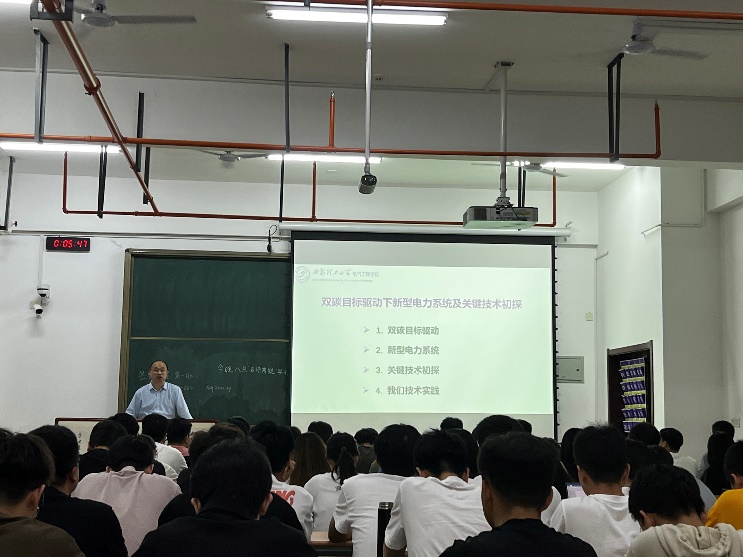 段建东教授以“双碳目标驱动下新型电力系统及关键技术初探”为题,分别从“双碳目标驱动”、“新型电力系统”、“关键技术初探”和“我们的技术实践”四个方面展开讲解。首先,段建东教授介绍了全球的气候背景以及各国人均碳排放量,表明了解决当下全球严峻的环境问题迫在眉睫,强调了“双碳目标驱动”的重要性。随后,段建东教授讲述了新型电力系统的概念及其特征,进行了新型电力系统实现“双碳目标”的可行性分析。在关键技术初探方面,老师分别介绍了促进可再生能源消纳、低碳综合能源系统规划、分布式电源与微电网以及电力设备运行维护技术等方面的“新型技术”。最后,段建东教授依据自己的科研经验给同学们讲解了“分散式风电项目”,让同学们认识到了有许多敢于创新、敢于实践的科研人员在为实现“双碳目标”默默奉献,艰苦奋斗,并取得了一定的科技成果。
