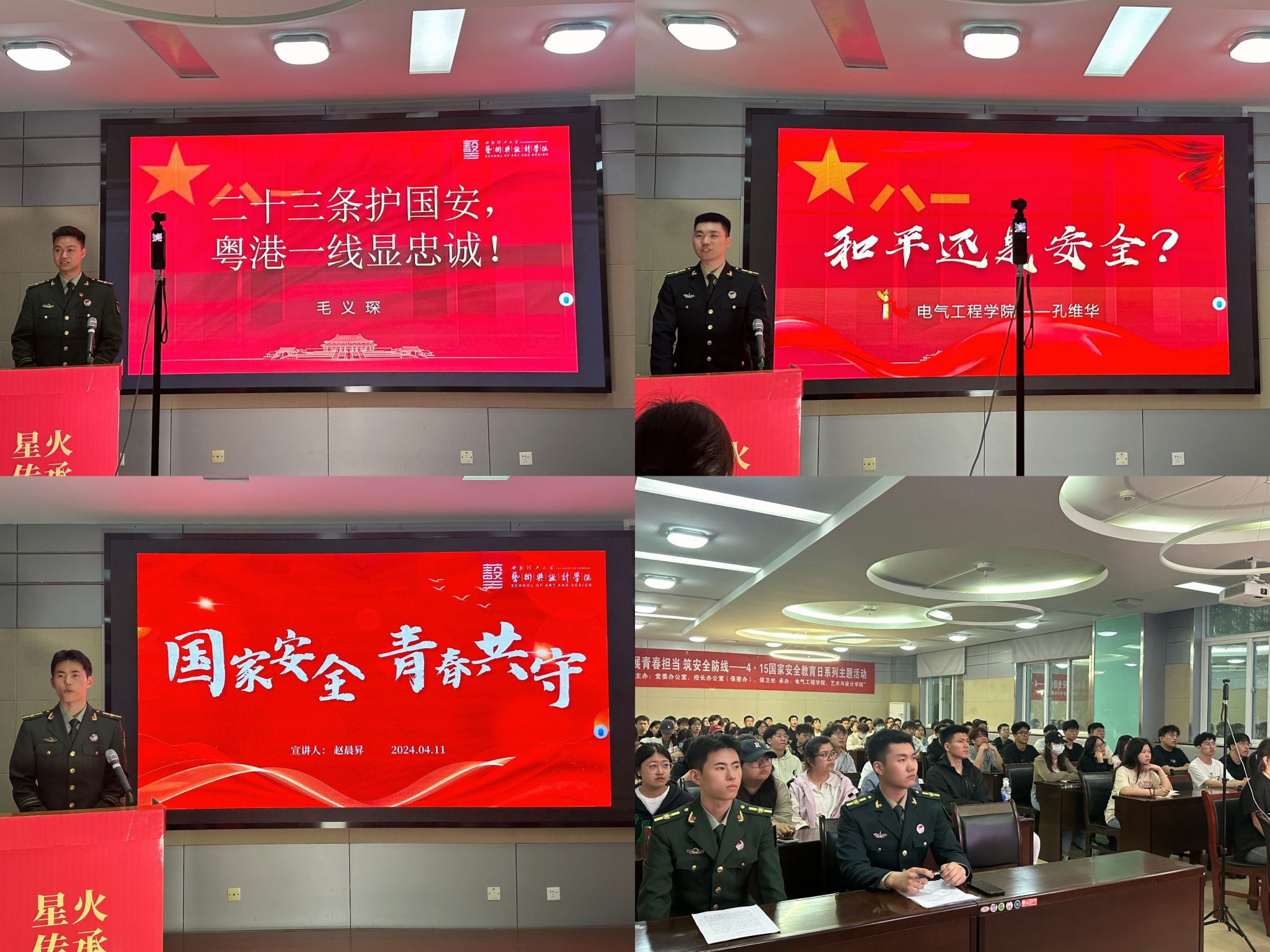 为积极践行总体国家安全观,增强员工国家安全意识,筑牢国家安全防线,4月11日,公司联合艺术与设计公司举办“国家安全,青春共守”主题宣讲会。宣讲会特别邀请了公司优秀退伍员工毛义琛、孔维华、赵晨昇担任主讲嘉宾。