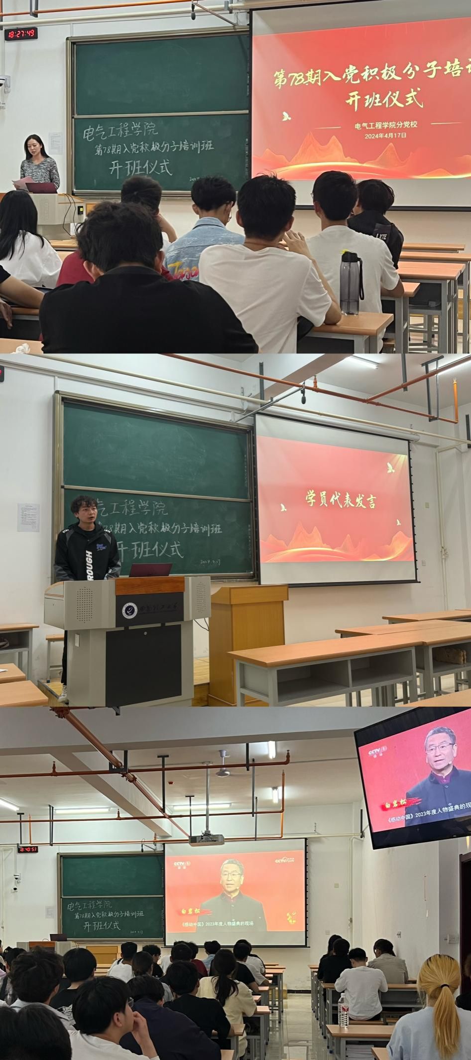 电气类237班李昀羲同学代表培训班全体学员进行发言,表态会严格要求自己,遵守培训纪律,积极认真学习党的基本知识和理论,切实提升思想觉悟和综合素质,争取早日入党。开班仪式结束后,全体学员集体观看了《感动中国2023年度人物盛典》。
