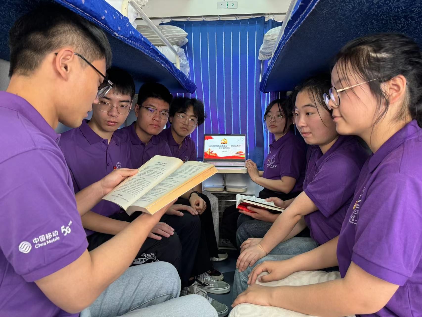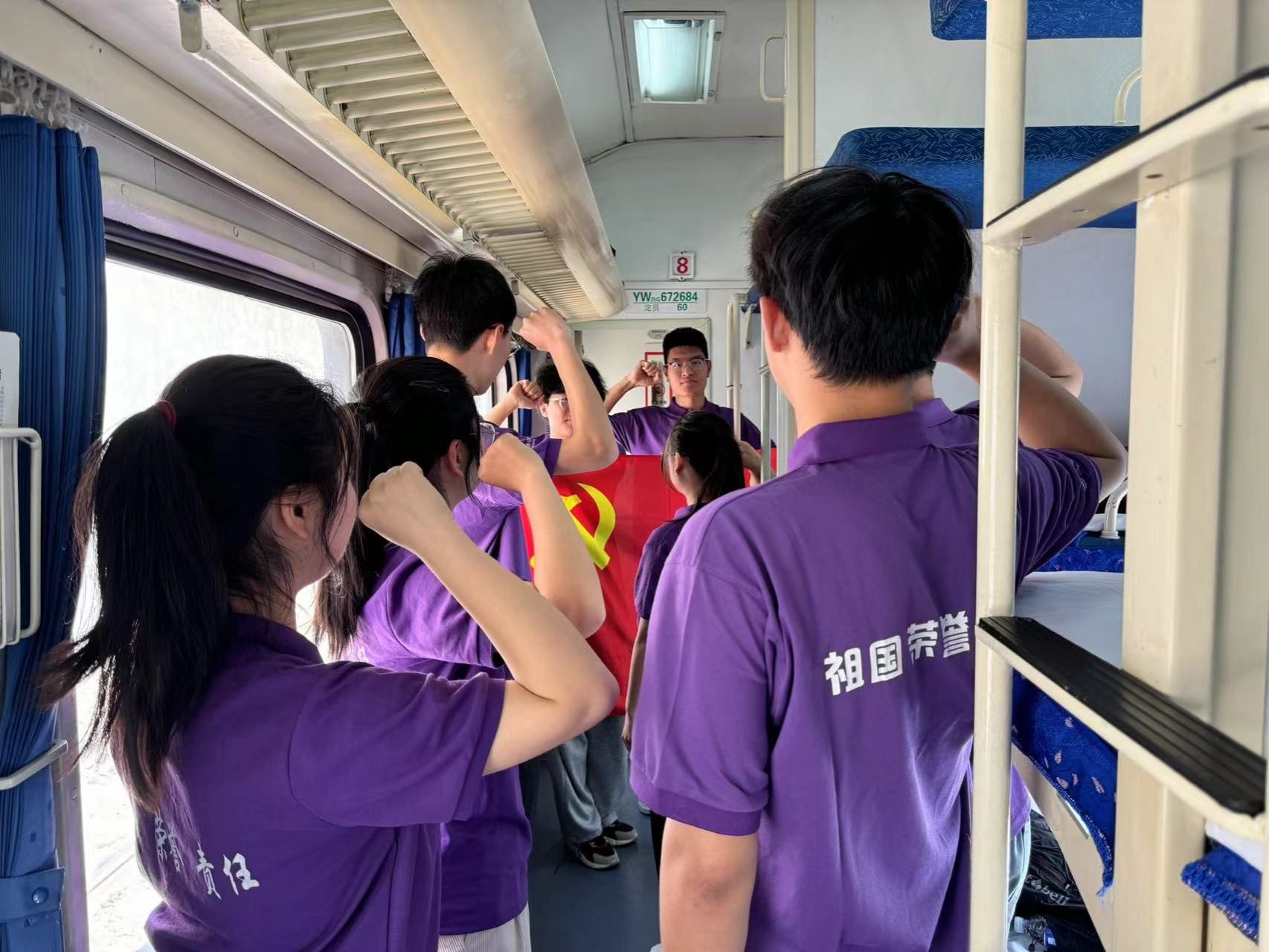 列车上,校级标兵党员张园洁还带领大家重温入党誓词,全体党员面对鲜红的党旗,紧握右拳,一字一句重温入党誓词,激昂的誓言是对党做出的庄严承诺,更是明确了新时代共产党员践行初心和使命的坚定方向。研231901班马点朋在列车上进行了红色经典诵读,体会到祖国的壮阔与强大,在经典中致敬历史,感悟红色力量。